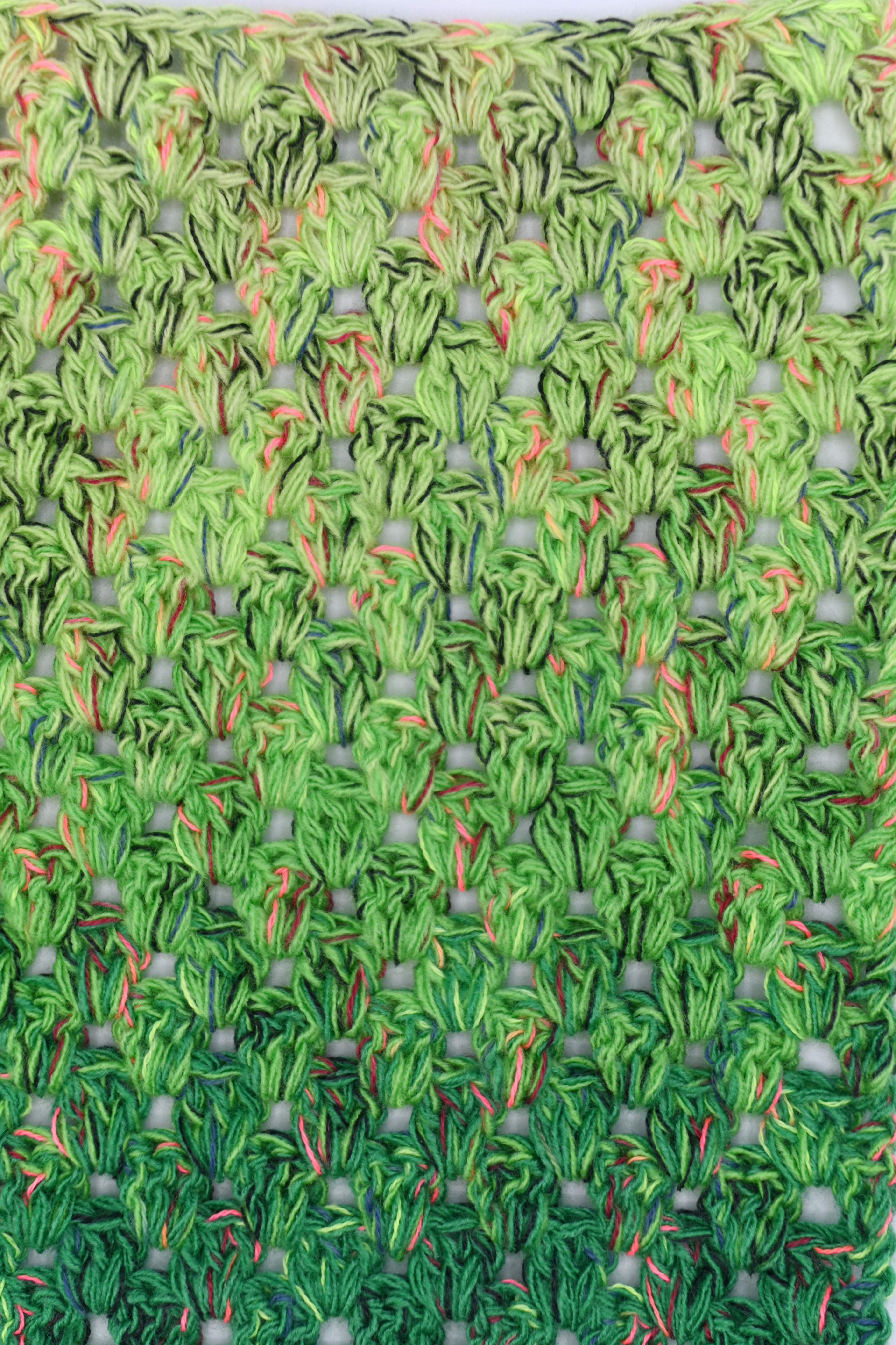 Es wechselt immer 1 Faden die Farbe. Bei diesem Farbübergang werden die Fäden miteinander verknotet. Die Knoten sind so klein, dass du sie problemlos mit einhäkeln/einstricken kannst.