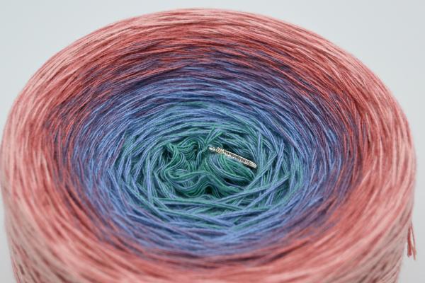 Es wechselt immer 1 Faden die Farbe. Bei diesem Farbübergang werden die Fäden miteinander verknotet. Die Knoten sind so klein, dass du sie problemlos mit einhäkeln/einstricken kannst.