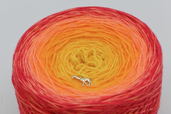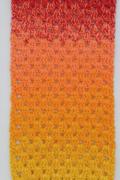 Es wechselt immer 1 Faden die Farbe. Bei diesem Farbübergang werden die Fäden miteinander verknotet. Die Knoten sind so klein, dass du sie problemlos mit einhäkeln/einstricken kannst.