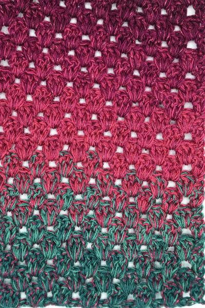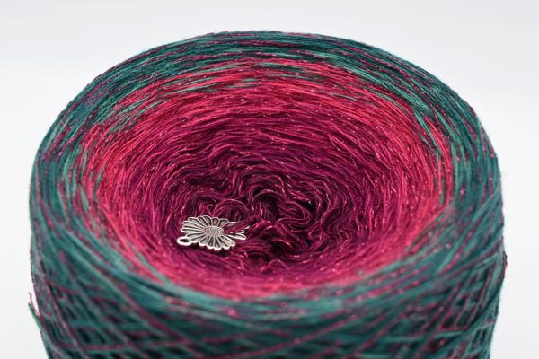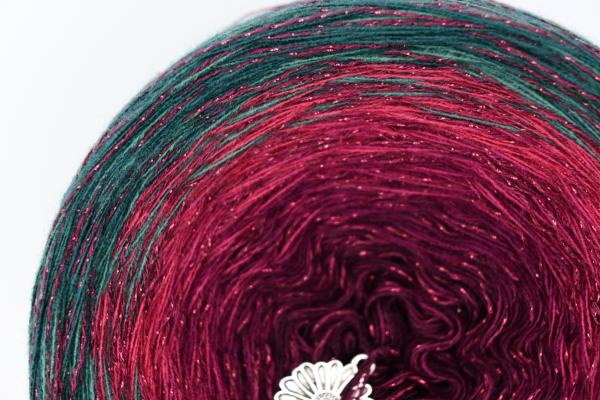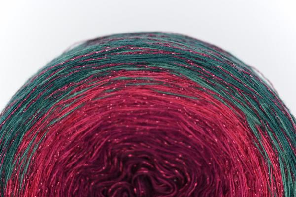 Es wechselt immer 1 Faden die Farbe. Bei diesem Farbübergang werden die Fäden miteinander verknotet. Die Knoten sind so klein, dass du sie problemlos mit einhäkeln/einstricken kannst.
