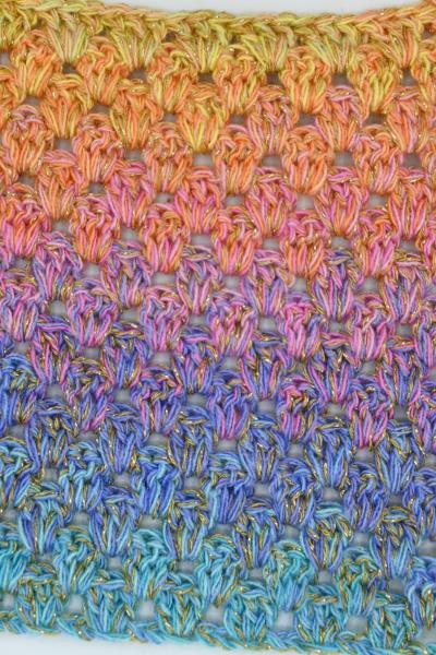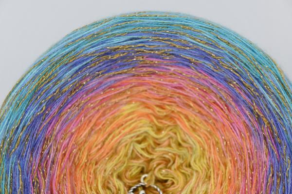 Es wechselt immer 1 Faden die Farbe. Bei diesem Farbübergang werden die Fäden miteinander verknotet. Die Knoten sind so klein, dass du sie problemlos mit einhäkeln/einstricken kannst.