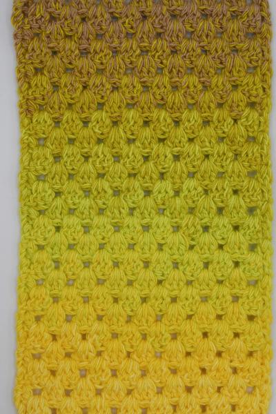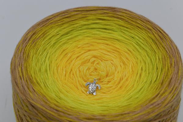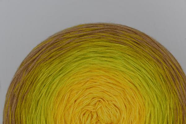 Es wechselt immer 1 Faden die Farbe. Bei diesem Farbübergang werden die Fäden miteinander verknotet. Die Knoten sind so klein, dass du sie problemlos mit einhäkeln/einstricken kannst.