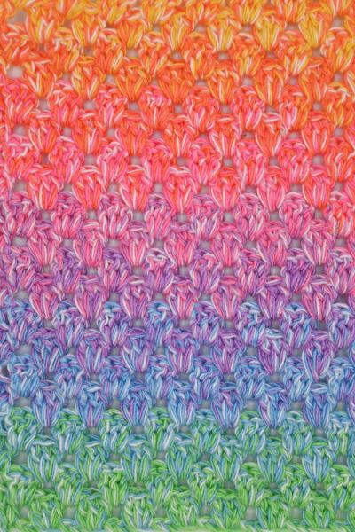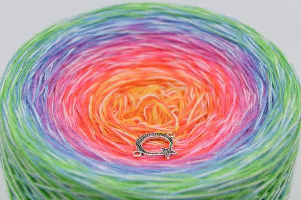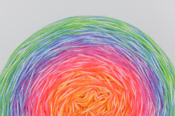 Es wechselt immer 1 Faden die Farbe. Bei diesem Farbübergang werden die Fäden miteinander verknotet. Die Knoten sind so klein, dass du sie problemlos mit einhäkeln/einstricken kannst.