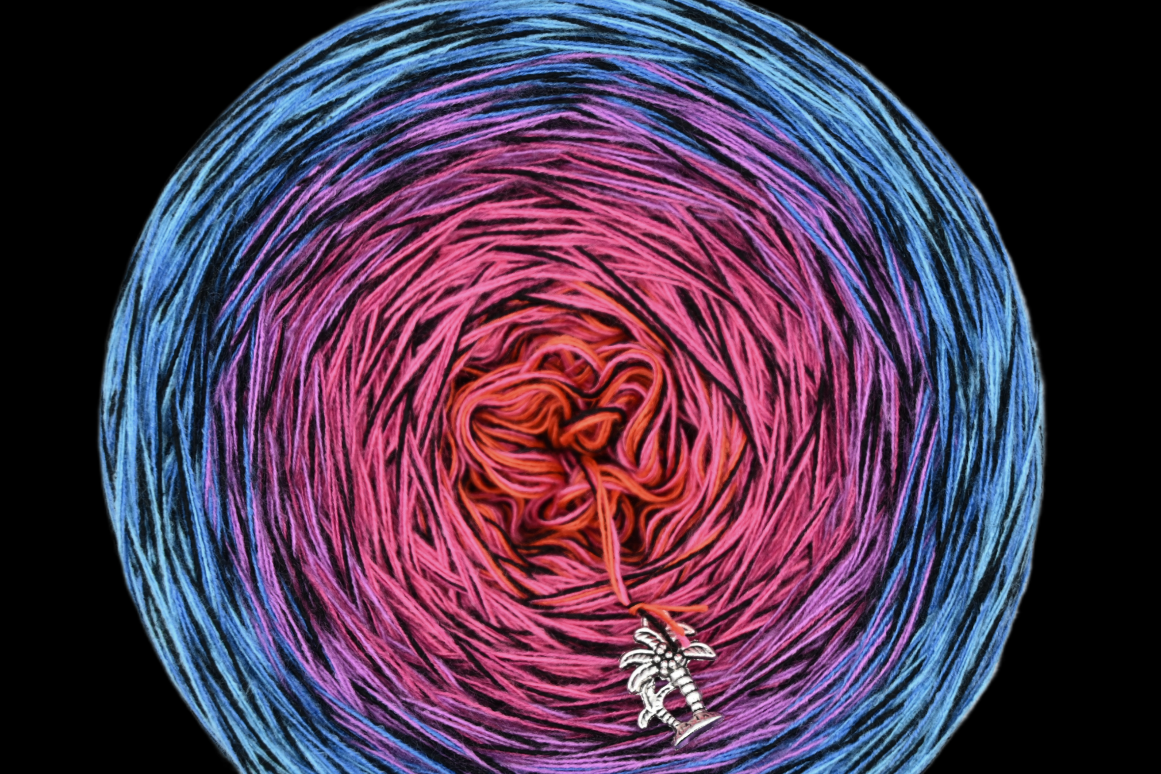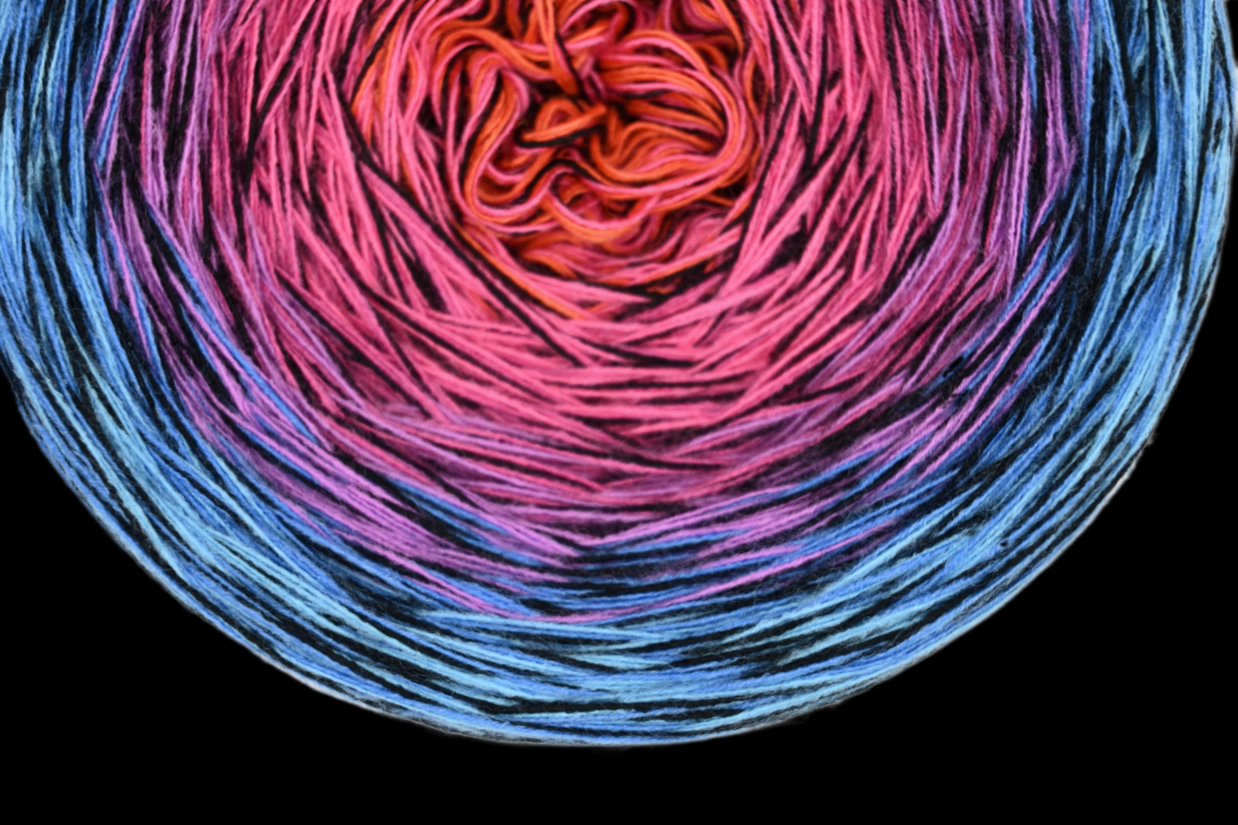 Es wechselt immer 1 Faden die Farbe. Bei diesem Farbübergang werden die Fäden miteinander verknotet. Die Knoten sind so klein, dass du sie problemlos mit einhäkeln/einstricken kannst.