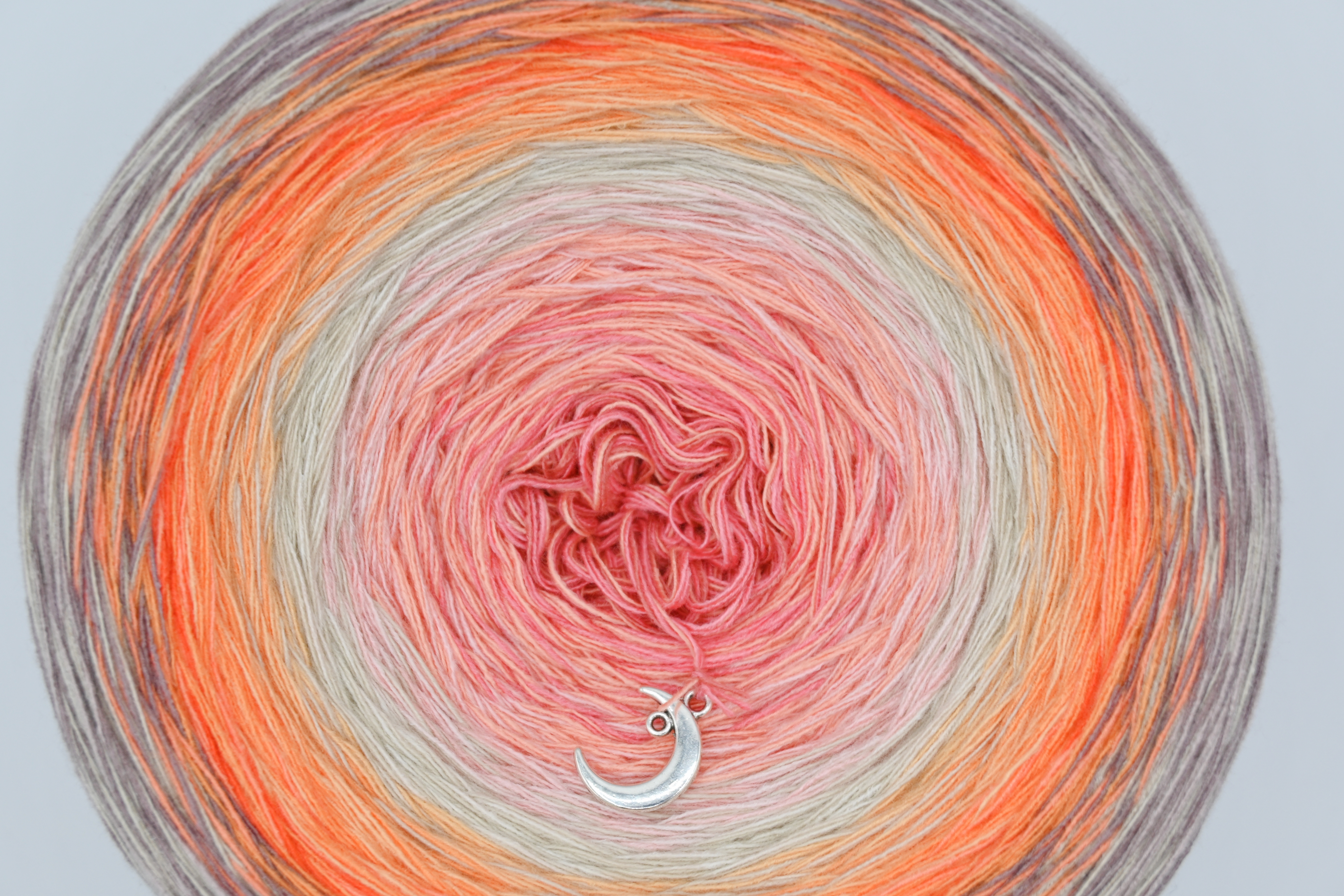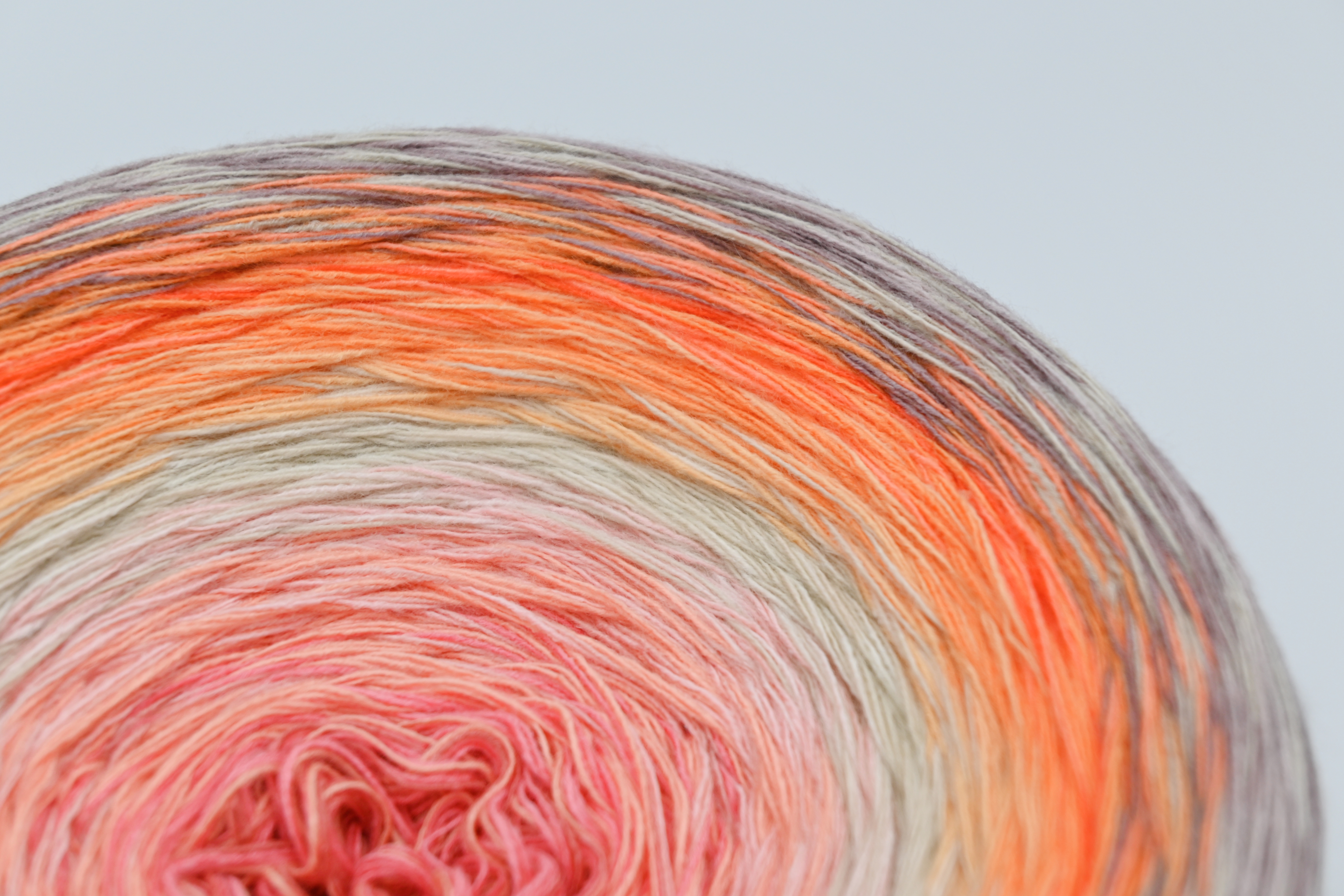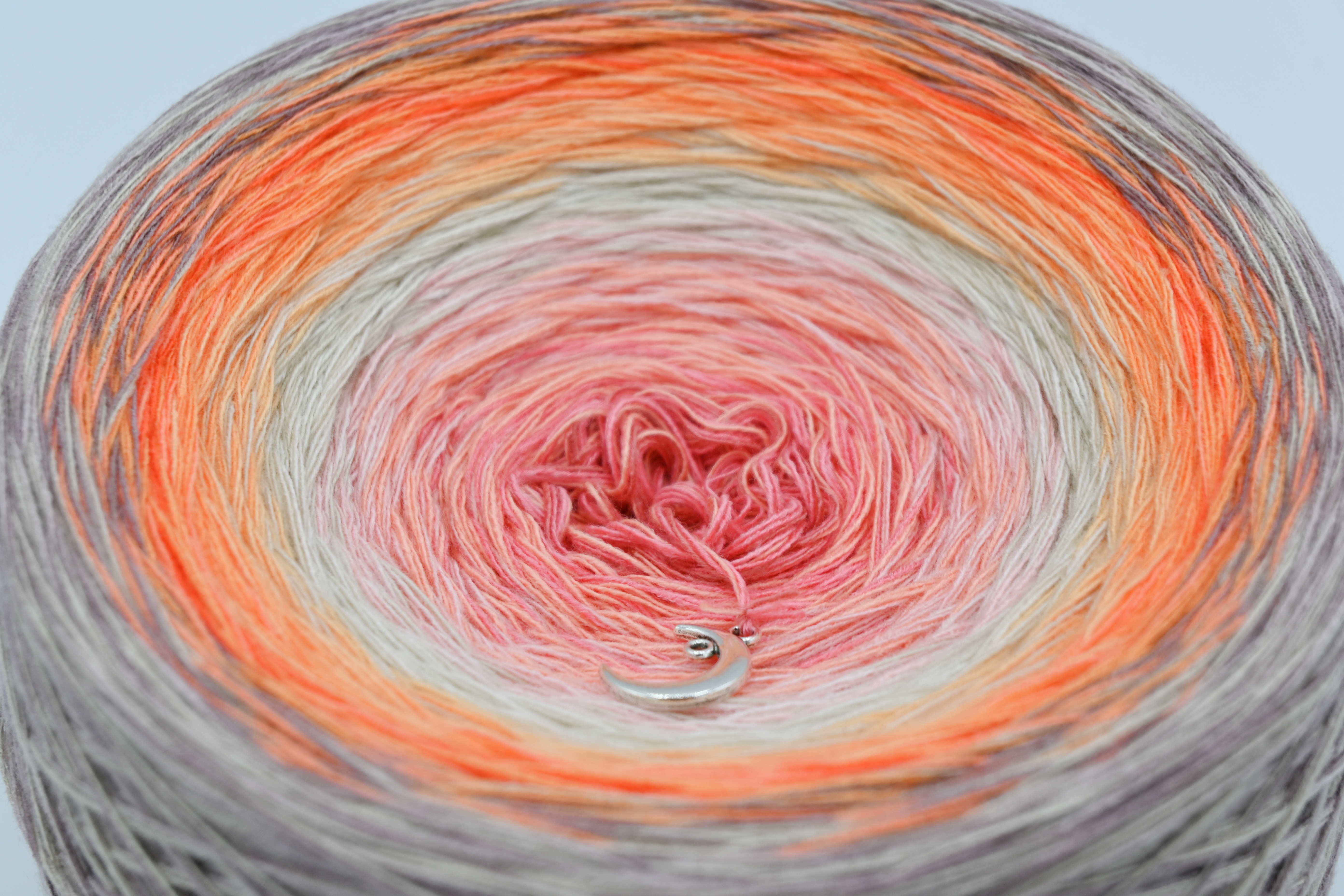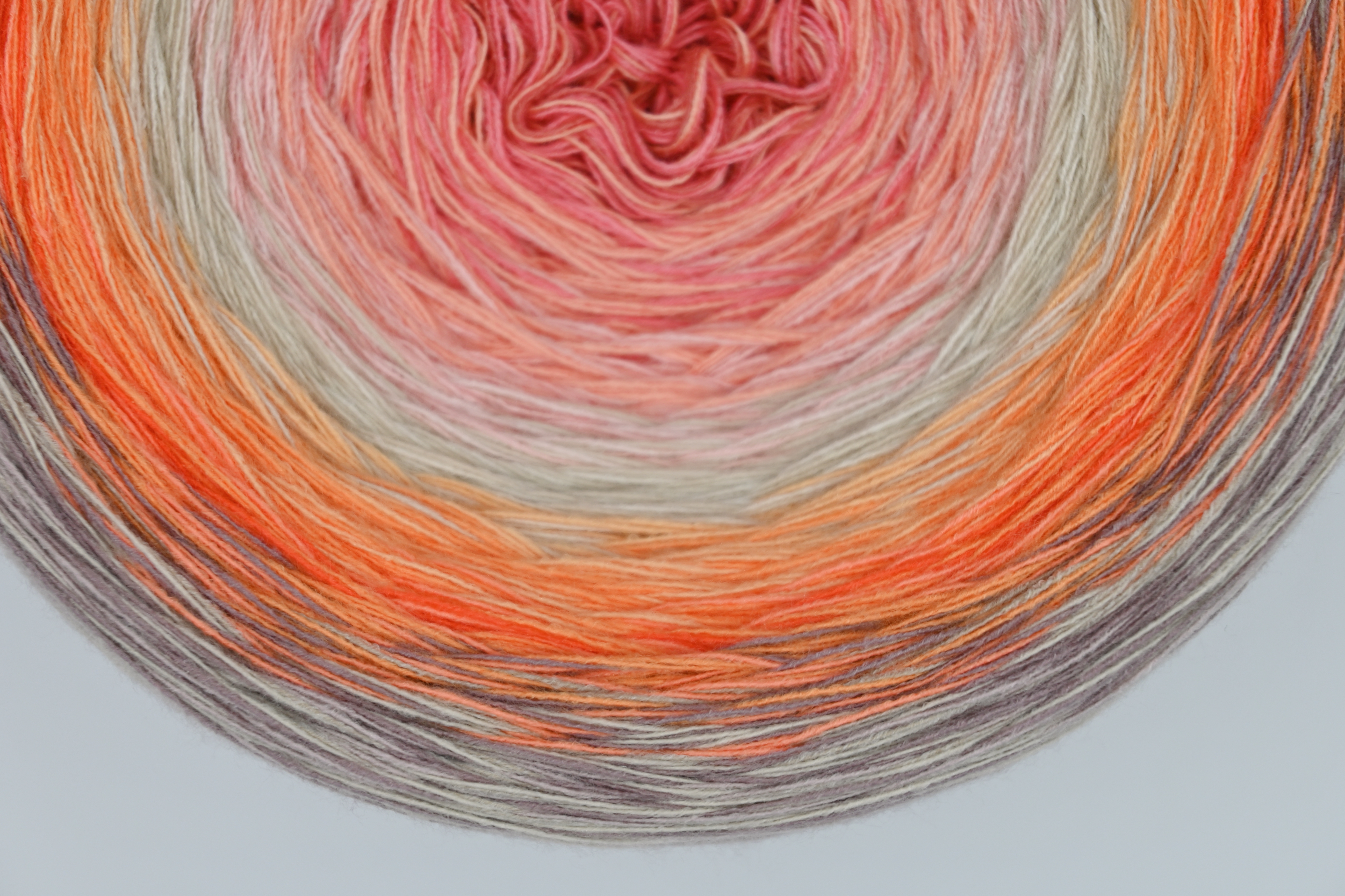 Es wechselt immer 1 Faden die Farbe. Bei diesem Farbübergang werden die Fäden miteinander verknotet. Die Knoten sind so klein, dass du sie problemlos mit einhäkeln/einstricken kannst.