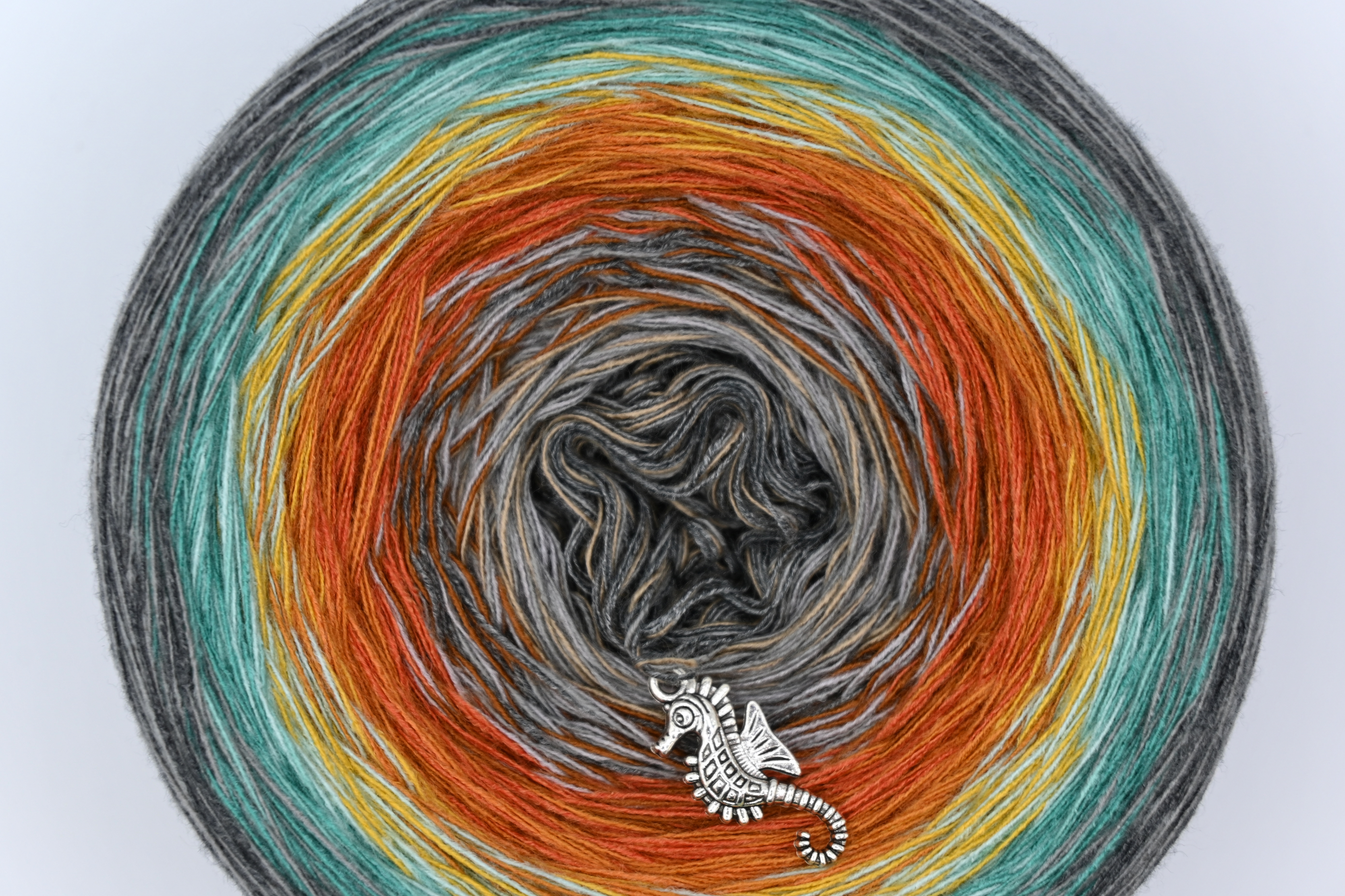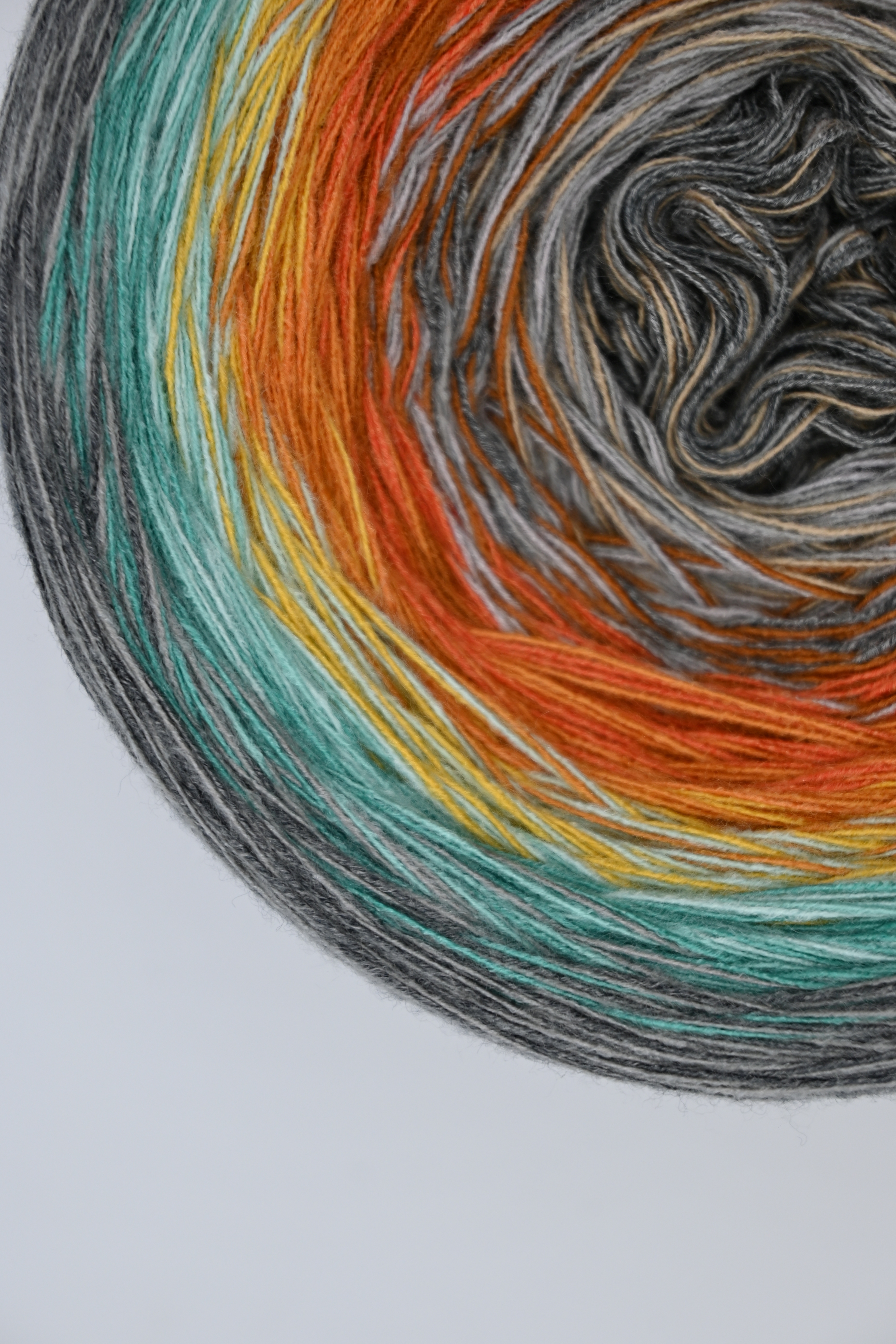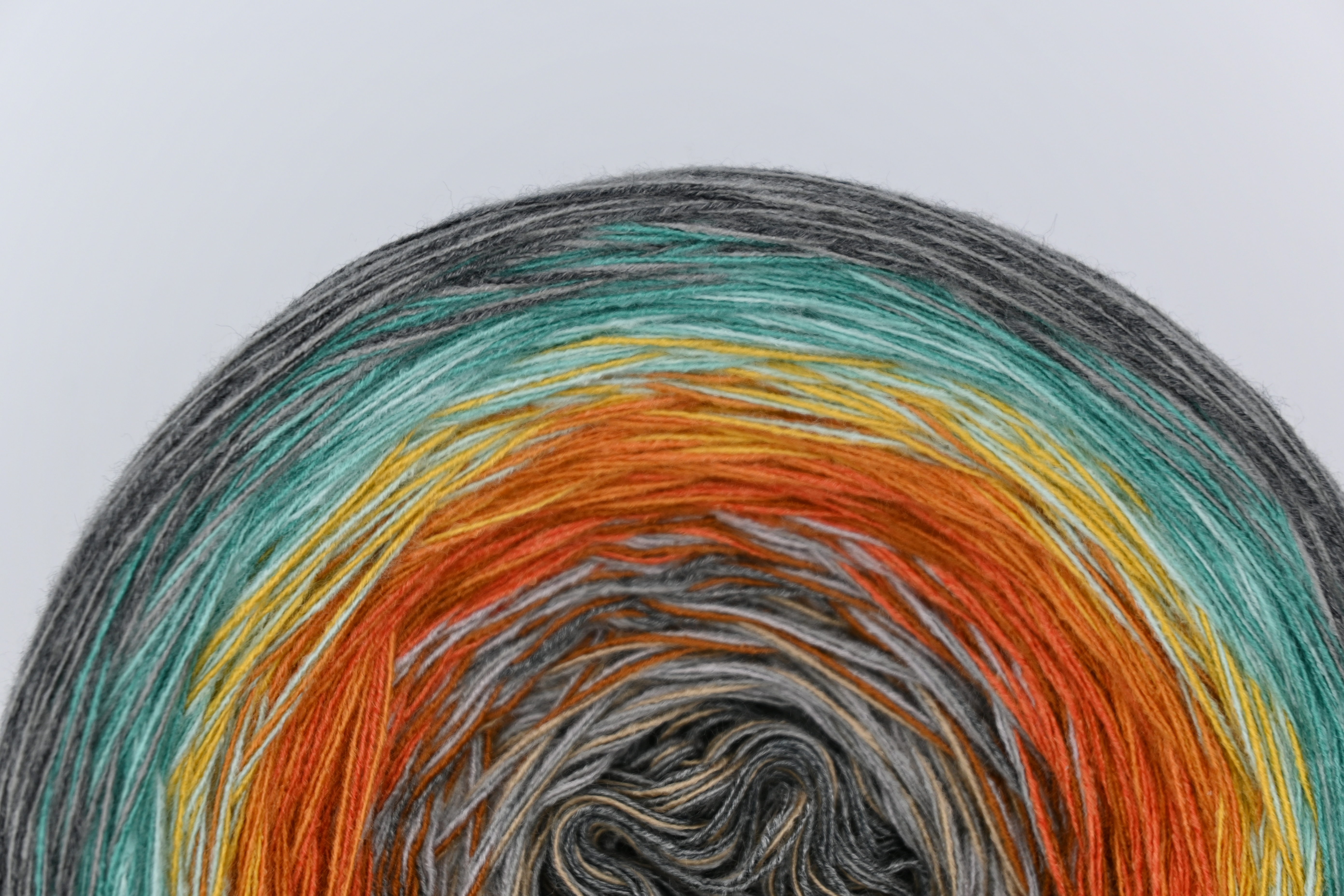 Es wechselt immer 1 Faden die Farbe. Bei diesem Farbübergang werden die Fäden miteinander verknotet. Die Knoten sind so klein, dass du sie problemlos mit einhäkeln/einstricken kannst.
