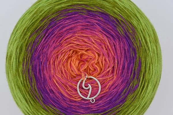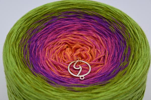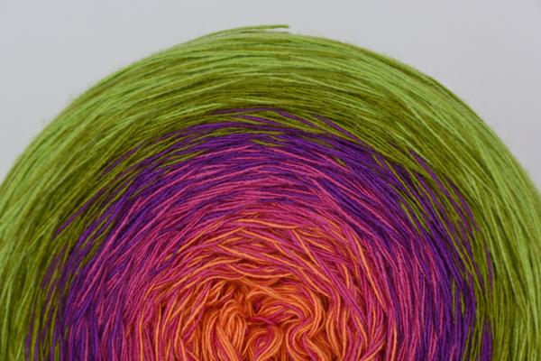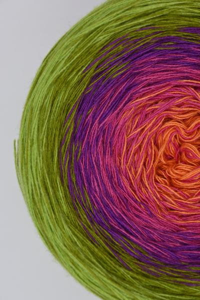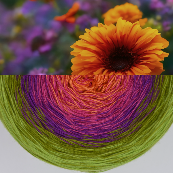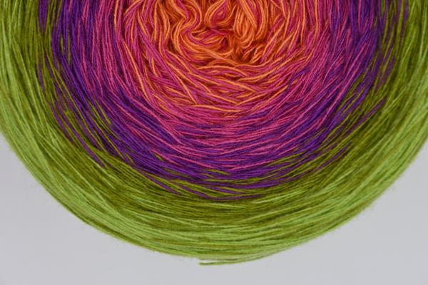 Es wechselt immer 1 Faden die Farbe. Bei diesem Farbübergang werden die Fäden miteinander verknotet. Die Knoten sind so klein, dass du sie problemlos mit einhäkeln/einstricken kannst.