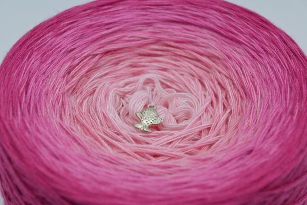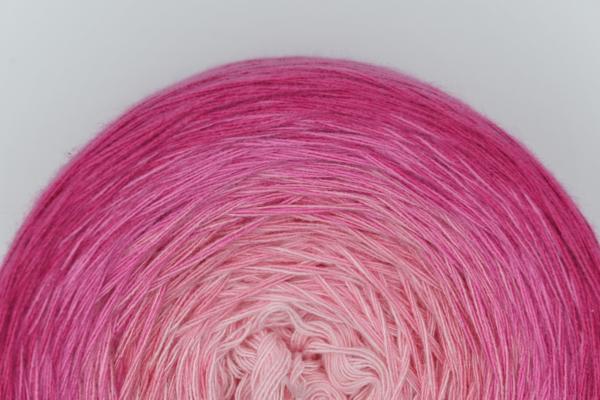Es wechselt immer 1 Faden die Farbe. Bei diesem Farbübergang werden die Fäden miteinander verknotet. Die Knoten sind so klein, dass du sie problemlos mit einhäkeln/einstricken kannst.