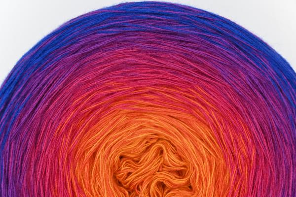 Es wechselt immer 1 Faden die Farbe. Bei diesem Farbübergang werden die Fäden miteinander verknotet. Die Knoten sind so klein, dass du sie problemlos mit einhäkeln/einstricken kannst.